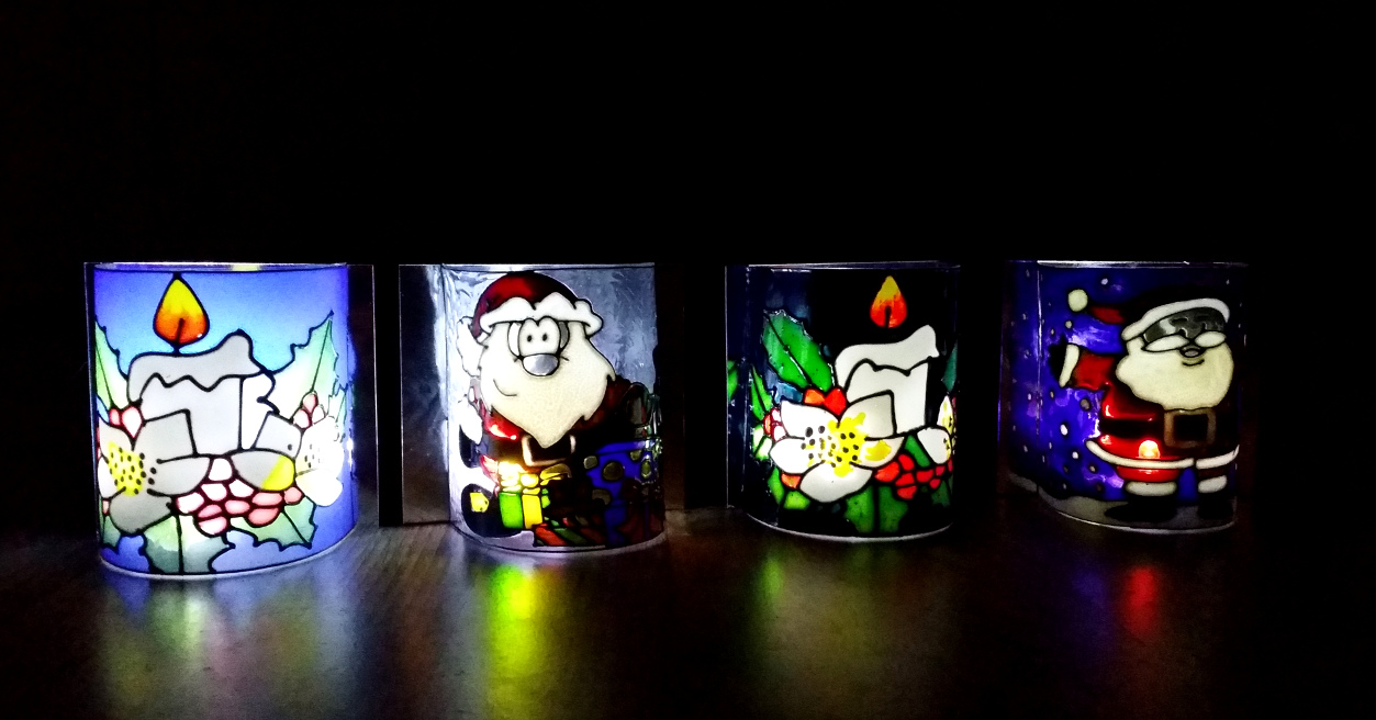 This is a great and inexpensive Christmas Glass Painting project. These simple lamps can only be used with the battery night lights. I hope that would be obvious as they are made of acetate and cardboard but it never hurts to stress the fact.